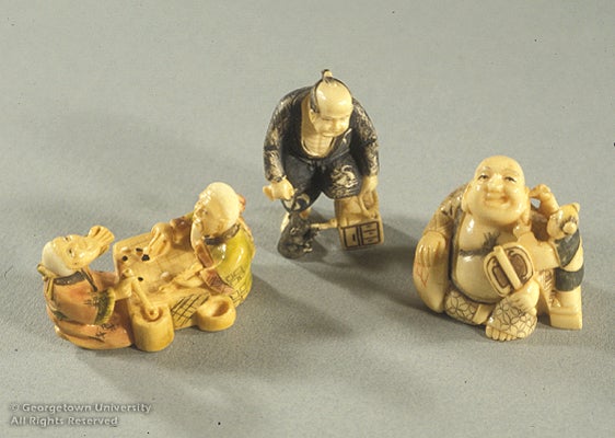 Gift of Hugh K. Long Netsuke are carved toggles, usually made of ivory or wood, used to attach hanging objects such as tobacco pouches to the sash of a man's kimono. There are holes in the bottom of each of these netsuke to allow passage of silken cords or ropes. Netsuke fell out of use after 1926 when western clothing styles replaced the traditional Japanese kimono.