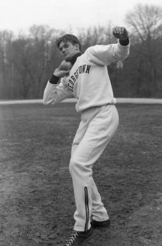 That would probably be Alfred C. “Al” Blozis (C’1942), who held multiple world records for the shot put. At 6 feet 6 ½ inches and 248 pounds, Blozis’ size and strength earned him such nicknames as “Big Al” and the “Hoya Hercules.” Participating in 26 college track meets between 1939 and 1941, he never lost a shot put event and held five world records concurrently: the 16lb indoor shot, the 12lb indoor and outdoor shot, and the 8lb indoor and outdoor shot. Right tackle on the Georgetown football team that went undefeated for 23 games and made an appearance in the 1941 Orange Bowl, he played tackle for the New York Giants after graduation.