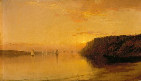 Inspired by the success of U.S. landscape painter Thomas Cole, Jasper Cropsey embraced the landscape as a means of building national pride and revealing God's hand in the beauty and detail of nature. This poetic image of a shimmering sunset over Cropsey's native Hudson River shows the growing interest in effects of light and atmosphere that came to be known as Luminism.