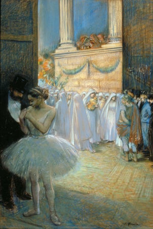 Jean-Louis Forain's evocative pastel drawing of a backstage encounter during a production of Aida reveals the influence of the artist's friend, Edgar Degas. Often sketching from the same model, they favored similar themes such as ballet dancers, the racecourse, and studies of the nude. Forain's work in turn inspired Manet and Cézanne, and he exhibited with the Impressionist painters on several occasions during the 1880s.