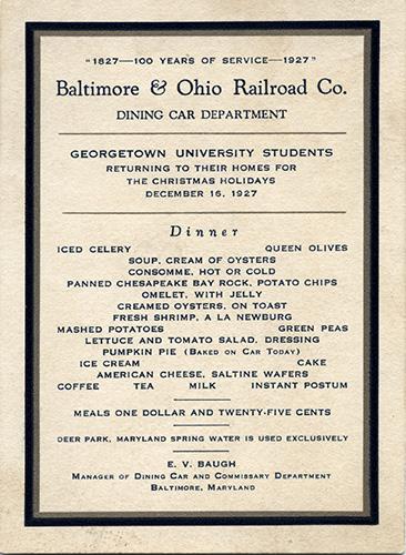 On December 16, 1927, Georgetown students traveling home for the winter break on the Baltimore & Ohio (B&O) Railroad were able to enjoy the items listed on this menu, including pumpkin pie baked fresh on the train, for the sum of $1.25.
