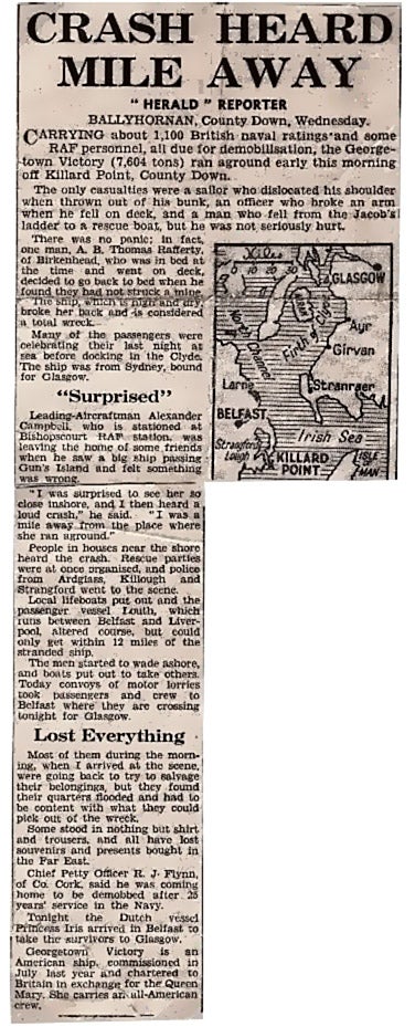 A curious footnote to this history is provided by the S.S. Georgetown Victory, which was among the last casualties of the Second World War. The 7000 ton Victory-class troopship was the 53rd in her class built at the Bethlehem-Fairfield shipyard at Baltimore, and launched April 28th, 1945. The Victory-class ships were an improvement on the famous Liberty ship design, providing greater tonnage, speed and comfort. After the war, many were converted to other purposes. For example, the Seton Hall Victory was converted for service as a radar ship during the Apollo program; the Notre Dame Victory became a Great Lakes bulk carrier; and the Vasser Victory became the Spanish liner Begoña. A few Victory ships were used by the military as late as the Viet-Nam conflict. Entering service near the end of the war, the Georgetown Victory and others like her, were given the happy task of transporting the troops for demobilization. Even so, the photo we have showing the ship leaving Sydney harbor for Glasgow, just a year after her launching, shows a battered and war-weary vessel; nonetheless, she must have seemed beautiful to the 1400 boys aboard, who were on their way home. Alas, she didn't complete the final voyage. On April 30, 1946, she ran aground off Killard Point, County Down, Ireland. All 1400 men were rescued by life boats and breeches buoy. The Illustrated London News noted that the ship was so close to land, that a number of men waded ashore through heavy oil and were cared for in nearby homes. The newspapers blamed heavy fog, but an authoritative history of the Victory ships says she was running at full speed on a fine clear evening. Undoubtedly, everyone aboard was anxious to reach port. In any case, by daybreak the next day, the vessel had broken her back on the ledge, and deteriorating weather conditions made her breakup seem imminent. Later, all remaining portable gear not already taken by looters was removed and the ship abandoned. Winter storms later separated the wreck into two parts. These sections were finally salvaged in 1951 and consigned to the ship-breakers at Troon.