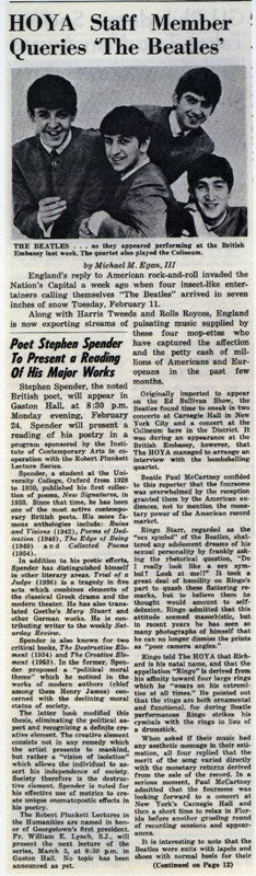 The Hoya has a long tradition of providing coverage and reviews of both on and off-campus entertainment, with reviews of off-campus plays and movies first appearing in 1929. One of the high points of The Hoya’s entertainment reporting came with this interview with The Beatles, who were in Washington for their first live concert appearance in the U.S.