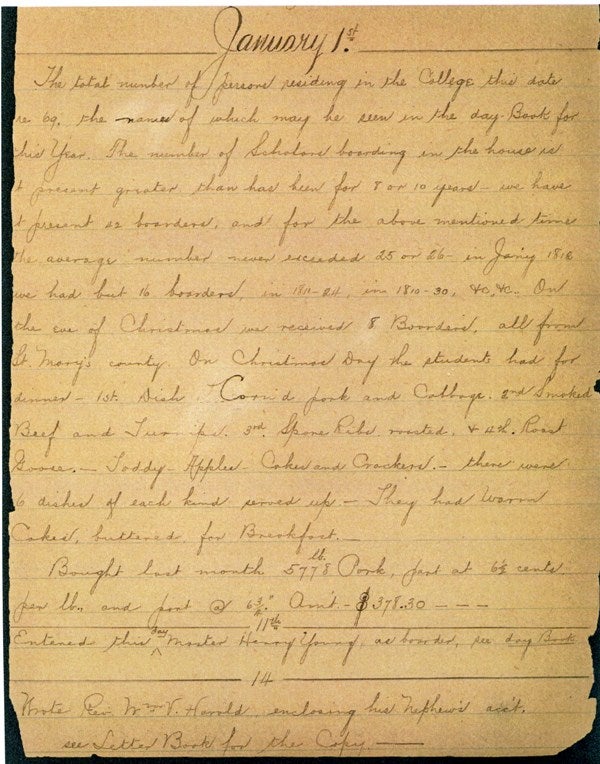 This poem, criticizing food on campus, was written by student Walter Chism during the 1867-1868 academic year. Close observers will see from the creases that the poem has been folded. Notes added at the bottom in the hand of Francis A. Barnum, S.J, who became University Archivist in 1898, explain that: Open, read and pass [a notation on the back of the poem] was the customary formula on all general notes which were circulated around the Study Hall – a practice that was strictly against the rules.