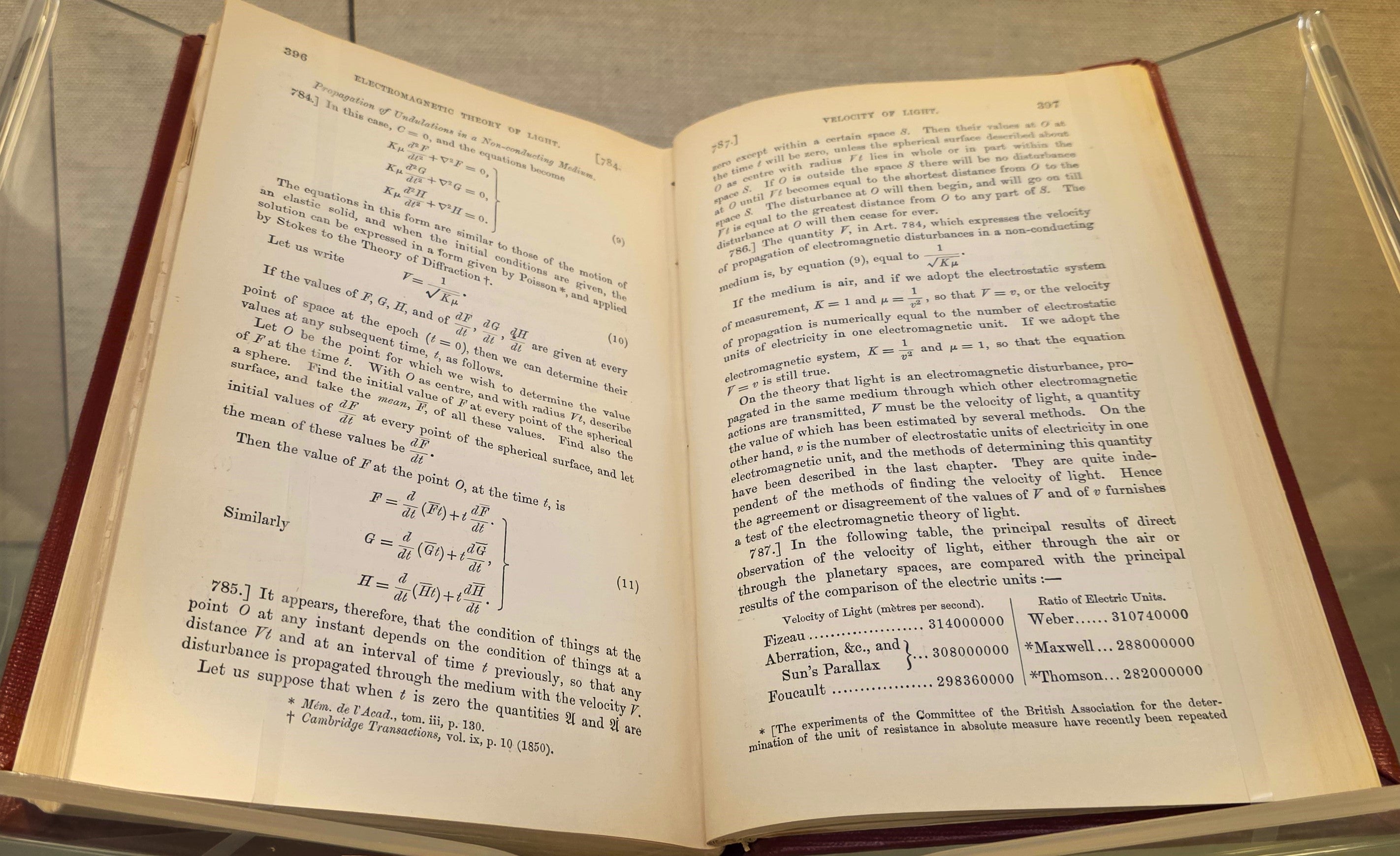 Shown here in the 1881 edition, open to the chapter “Electromagnetic Theory of Light,” the text formulates a cohesive wave theory that irrevocably unified the previously separate fields of electricity and magnetism in a set of equations. (Those equations were later reformulated by Oliver Heaviside into the four equations familiar to us today.) On these pages, Maxwell calculates the theoretical velocity of these newly discovered electromagnetic waves and compares it against the experimentally measured speed of light.
