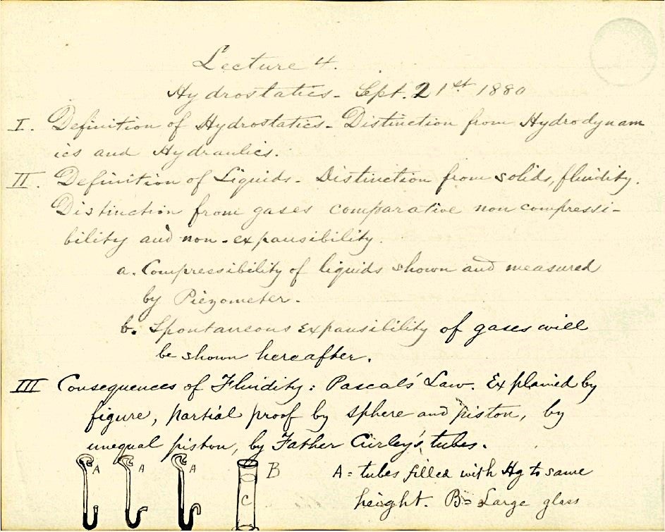 Since its founding in 1797, Georgetown has maintained a tradition of teaching physics, originally through the disciplines of astronomy and natural philosophy. This tradition expanded in the mid-nineteenth century with the founding of the Georgetown Observatory in 1843. Father James Curley, S.J., served as the observatory's first director while also teaching. His 1849 lecture notes, displayed here, document the university's early physics curriculum.
