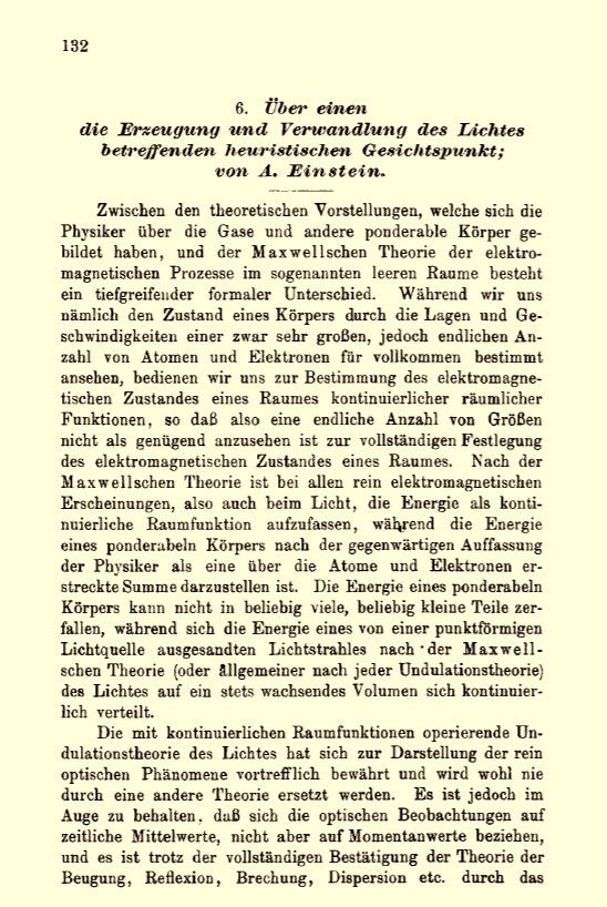 - Einstein, Albert. (1905). "Über einen die Erzeugung und Verwandlung des Lichtes betreffenden heuristischen Gesichtspunkt" [On a Heuristic Point of View about the Creation and Conversion of Light]. Annalen der Physik. 17 (6): 132–148.