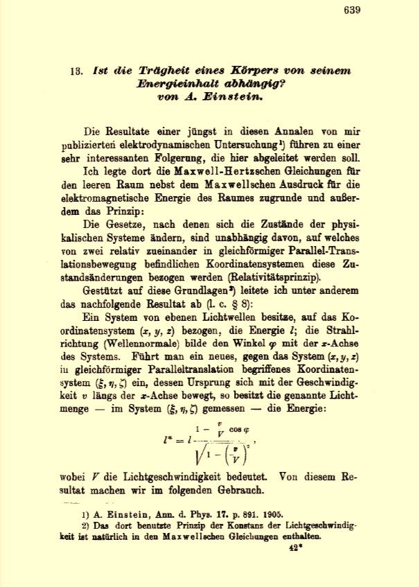 - Einstein, Albert. (1905). "Ist die Trägheit eines Körpers von seinem Energieinhalt abhängig?" [Does the Inertia of a Body Depend Upon Its Energy Content?]. Annalen der Physik. 18 (13): 639–641.