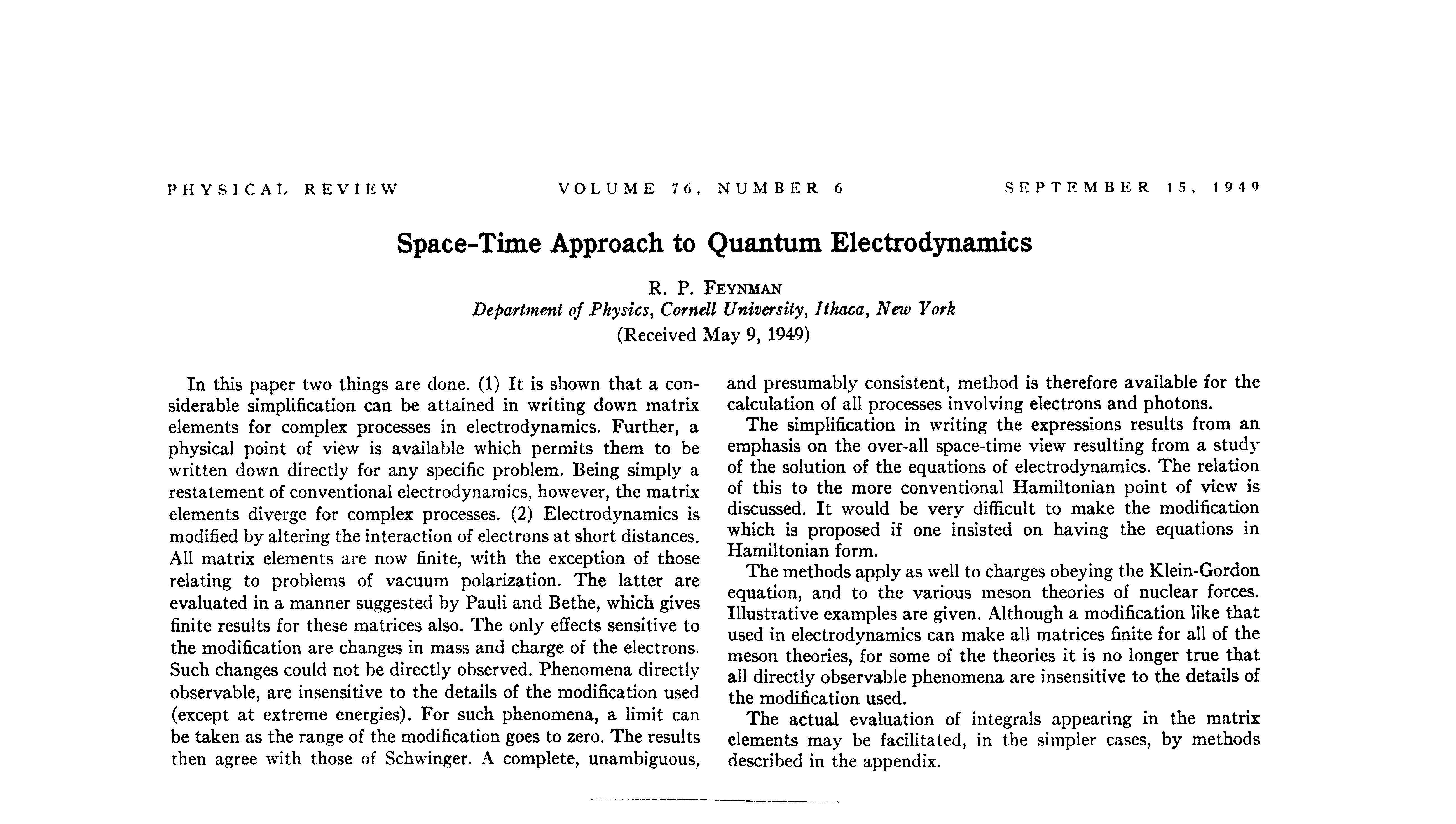 - Feynman, R. P. (1949). "Space-Time Approach to Quantum Electrodynamics". Physical Review, 76(6), 769–789.