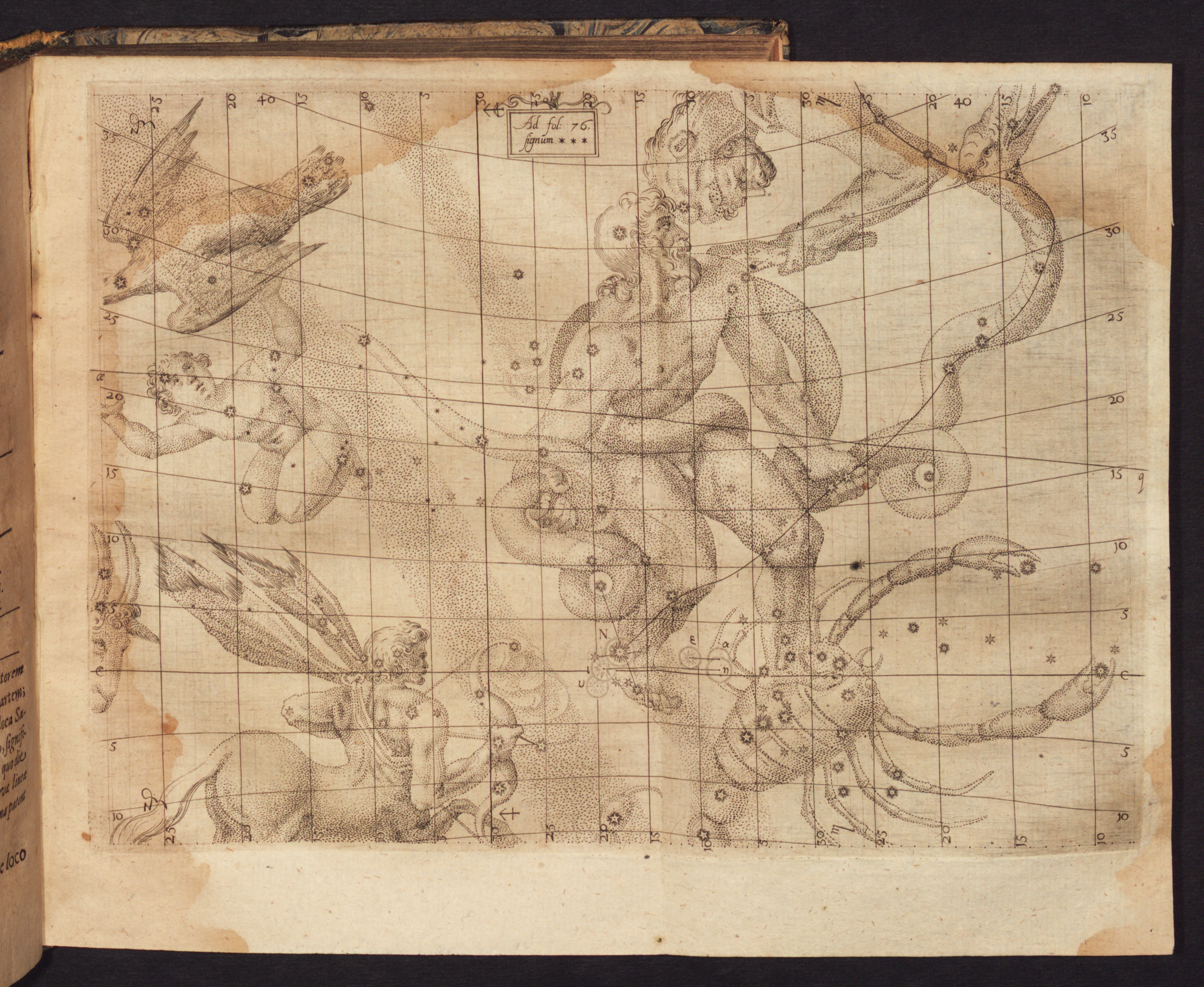He provided a star map showing the supernova, marked with an N, in the right foot of the constellation Ophiuchus (the Serpent Bearer). Kepler used this map to show the star’s alignment with a great conjunction of Mars, Jupiter, and Saturn, and to investigate whether these planetary movements were physically linked to the star's birth.