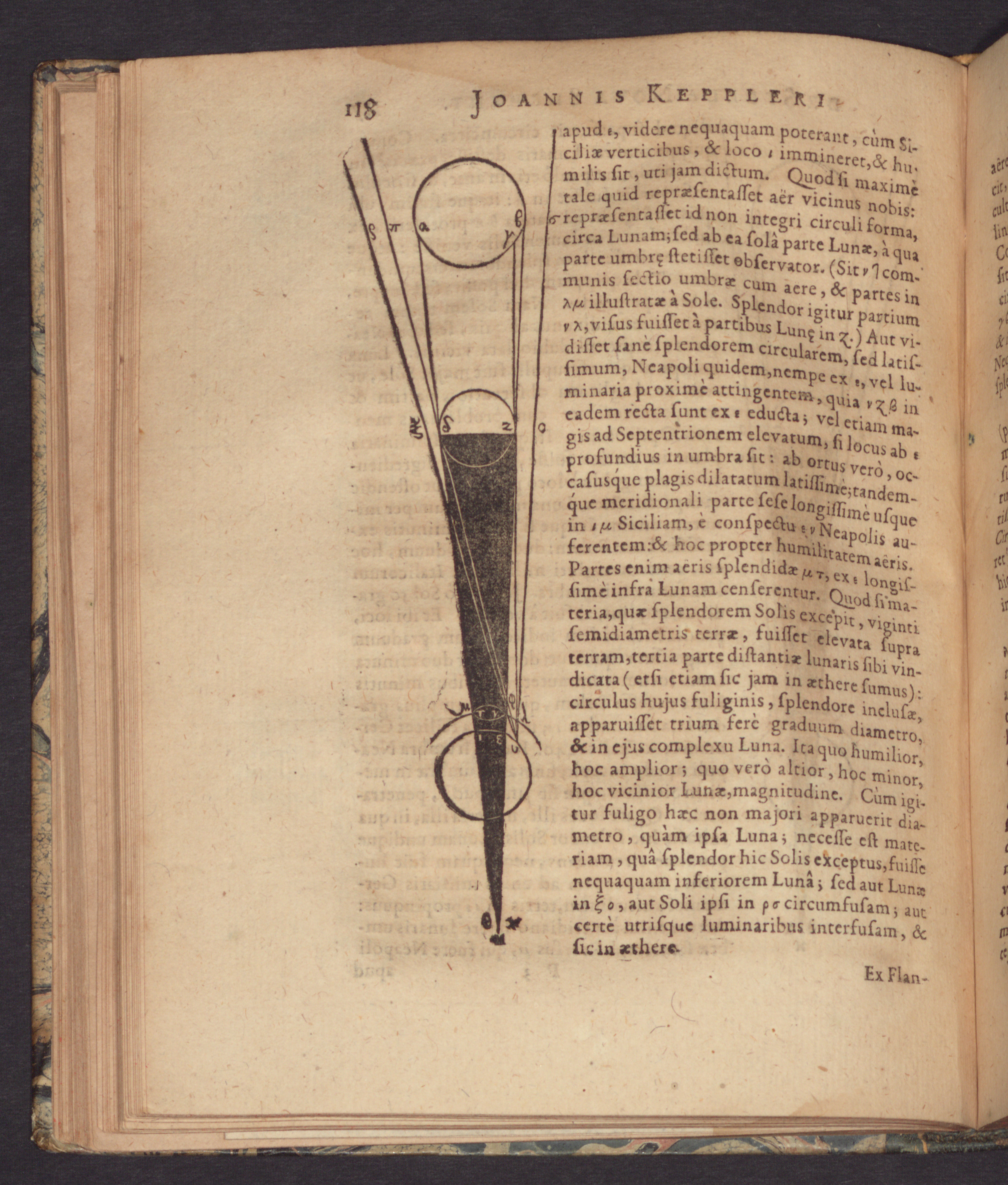 The diagram on page 118 illustrates a solar eclipse, tracing light rays from the Sun through the Moon toward a human eye. Kepler used the geometry of the Moon's shadow cone to investigate the solar corona. He demonstrated that the Earth's atmosphere cannot be the source of scattered sunlight as it is completely shadowed by the moon during totality, and proposed that the light must be scattering off a diffuse material located higher in space.