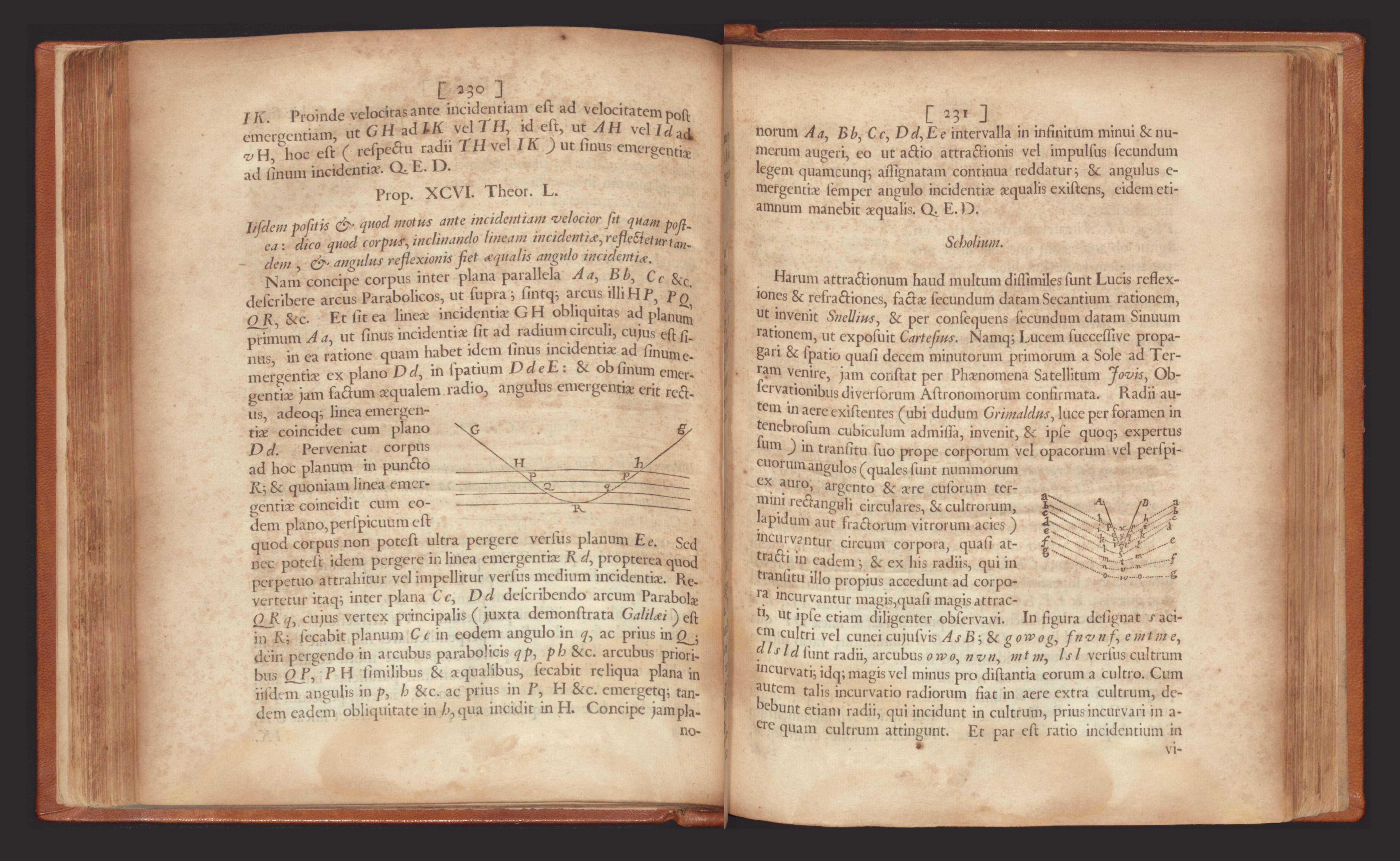The displayed pages (230–231) illustrate his attempt to treat optics as a branch of mechanical physics. In Proposition XCVI, Newton models a light particle passing through parallel planes of force. By referencing Galileo’s earlier work on parabolic trajectories, he demonstrates how a particle's path might curve and reflect at a boundary, offering a mechanical rationale for why the angle of incidence must equal the angle of reflection.