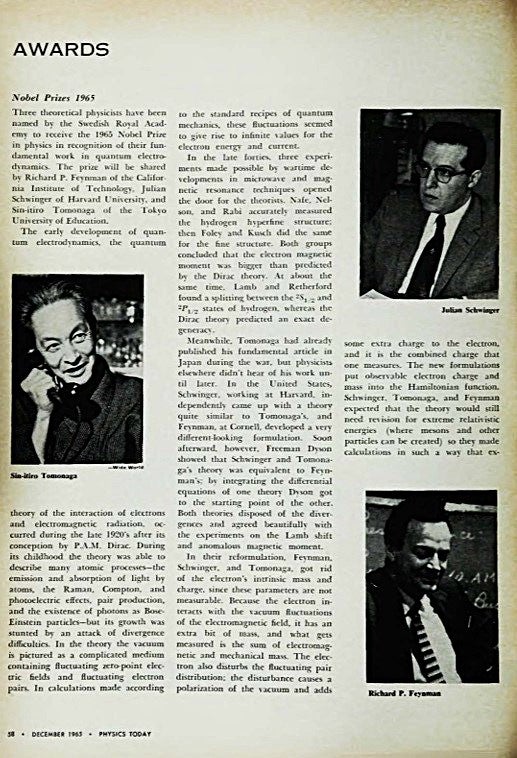 The excerpt displayed here from Physics Today details the 1965 Nobel Prize awarded jointly to Shinichiro (Sin-Itiro) Tomonaga, Julian Schwinger, and Richard Feynman. Working independently in the late 1940s, these three physicists developed a mathematical procedure called renormalization, successfully establishing QED as a complete, working theory.