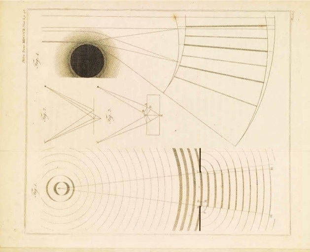 This consensus was challenged by experiments carried out by Thomas Young. He observed that by passing a point source of light through closely spaced pinholes (later slits), a pattern of alternating light and dark bands was formed on a screen placed behind the pinholes (slits). The results were presented to the Royal Society in 1801. Displayed here is his paper, published in 1802, where he proposed that these interference fringes could be explained if light propagated as a wave.