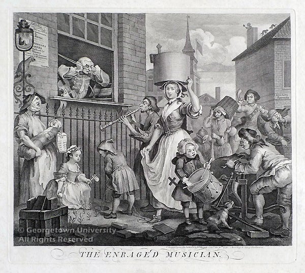 William Hogarth, originator of the satirical tradition in British graphic art, is known for his moralizing narrative series such as A Harlot’s Progress (1732), A Rake’s Progress (1735), Marriage à la Mode (1745), and Industry and Idleness (1747). This engraving of The Enraged Musician was conceived as a companion piece to his print entitled The Distressed Poet, both copied from Hogarth’s original paintings. Capturing visually the din of London street life, the artist populated his scene with various noise-making characters and creatures whose combined efforts have thwarted a court musician at an open window from his practice for an upcoming performance of the Beggars Opera. The composition pivots around the central figure of a graceful milkmaid, her mouth open in song. In his three-volume biography, Ronald Paulson proposes the theme of nature versus art in contrasting the purity of the milkmaid with the affectations of the foreign violinist: “Her beauty and grace are surely intended to suggest that her voice, which among the sounds of nature is art, is more beautiful than the musician’s violin because less constricted by conventions.”