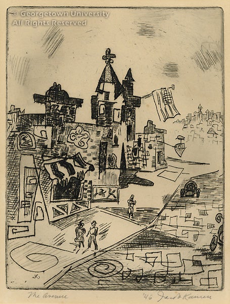 Jacob Kainen was the acknowledged dean of the Washington art community up until his death in 2001. Born in Connecticut to immigrants from Russia, Kainen was established in the New York art scene before moving to Washington in 1942 to become the first curator of prints for the Smithsonian Institution, a position he held until 1969. While in New York, Kainen joined the graphic art division of the WPA Federal Arts Project which enabled him to work with very skilled, seasoned print makers and to experiment with various techniques. Kainen’s prints, largely abandoned during his tenure at the Smithsonian, reflect his interest in urban imagery. The Avenue recalls the topsy-turvy perspective of John Marin’s New York views, while the doodled swirls and geometric forms forecast the full-fledged abstraction of Kainen’s later prints.