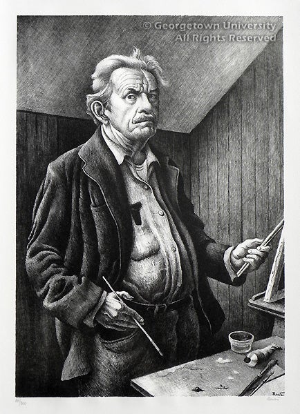 This self-portrait, distributed by the Associated American Artists gallery in New York, was based on a painting Benton made in 1970. In his classical pose beside his easel, Benton—consciously or not—places himself within the tradition of great Western artists. It is part of the James Elder self-portrait collection, judiciously negotiated by Father Haller, which includes approximately four hundred fifty self-portraits by three hundred thirty artists, with a focus on 20th century Americans and local area artists. Elder was a reference and rare book librarian at the Library of Congress, and an avid print collector. At his death in 1981 he had accumulated more than a thousand prints in his Adams Morgan apartment, and a major exhibition was mounted at the Athenaeum in Alexandria, Virginia in 1984.