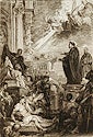To give added emphasis to his correction, Barry included in the upper left corner of his print Pope Adrian discussing the episode with a small group of dignitaries, including Benjamin Franklin, Bishop Butler, and the Archbishop of Canterbury. The sixteenth-century Spanish Jesuit Juan de Mariana, often remembered for his writings on tyrannicide, observes the scene from above in the background.