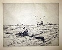 German accounts of this 1917 event state that during midnight operations, submarine U-48 ran aground on the dangerous Goodwin Sands and was found the next dawn by destroyer HMS Gypsy and several armed drifters. The title Dawson gives his etching gives the British ships a less opportunistic and more actively defensive role.