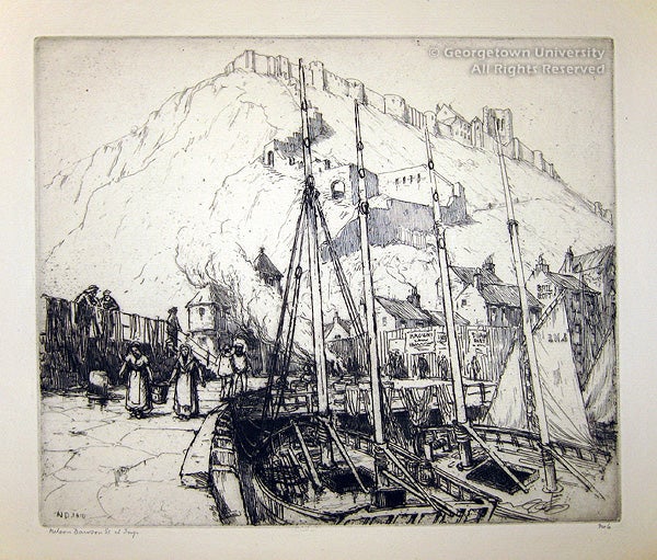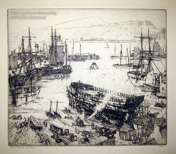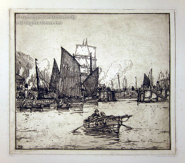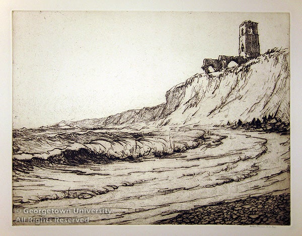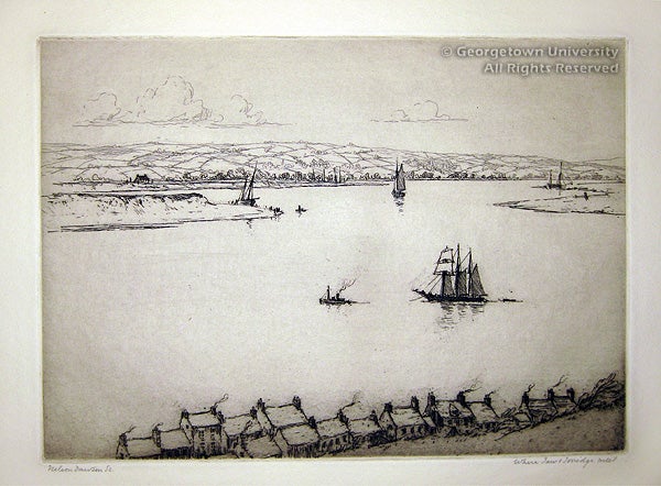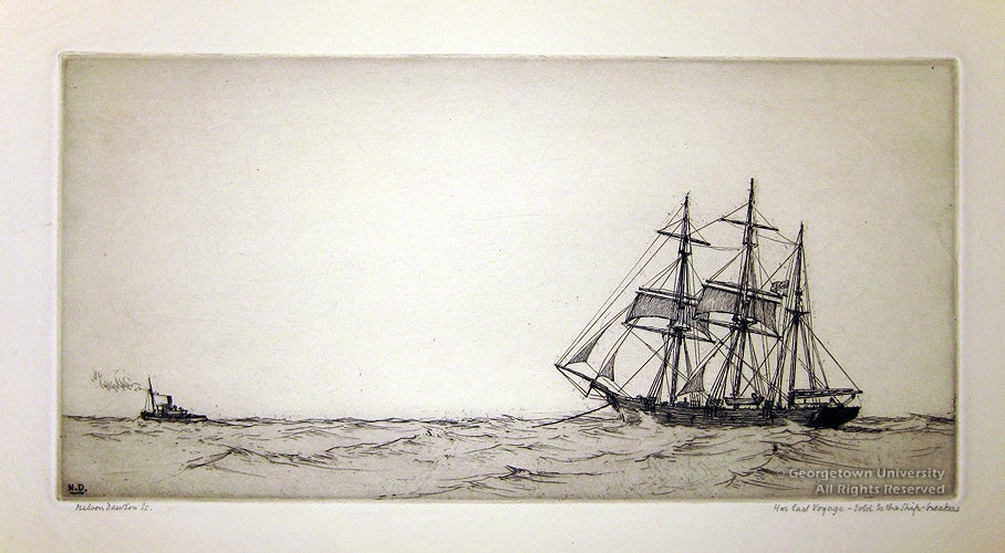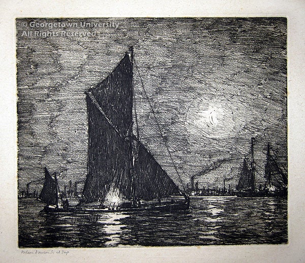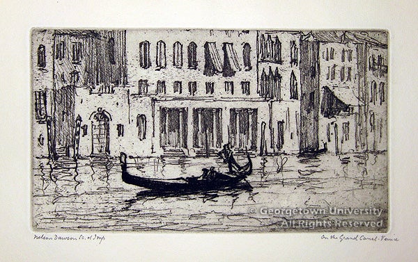 While Georgetown does not own any of Dawson’s metal works, the Special Collections Research Center is honored to maintain more than thirty examples of his printmaking oeuvre. These evocative coastal images of England, France and the ever-resplendent Venice were judiciously selected and acquired by our late Curator Emeritus, Father Joseph A. Haller, S.J., to whose memory this exhibition is respectfully dedicated.