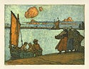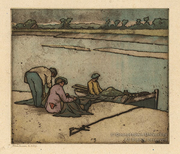 The figural scenes shown here, created when Dawson visited the small fishing port of Éaples, near Boulogne, represent a foray into the technique of color etching, combining his affinity for watercolor with these timeless images of a French fishing community.