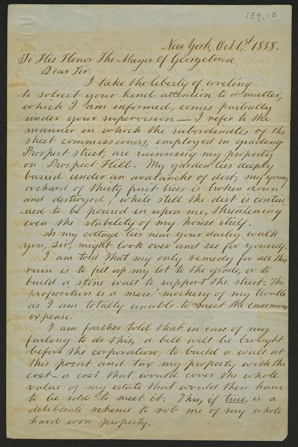 So writes Southworth to the Mayor of Georgetown about the plight of her home in the face of an encroaching mountain of dirt being used to re-grade Prospect Street, in a letter that would not seem out of place in a contemporary city council meeting. While the mayor’s reply remains unknown, judging from photos taken decades later this was not an issue that was quickly resolved.