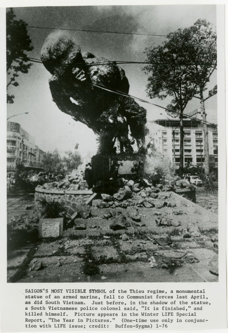“Saigon’s most visible symbol of the Thieu regime, a monumental statue of an armed marine, fell to Communist forces last April, as did South Vietnam.” This picture appeared in the winter LIFE Special Report, “The Year in Pictures,” in 1976.