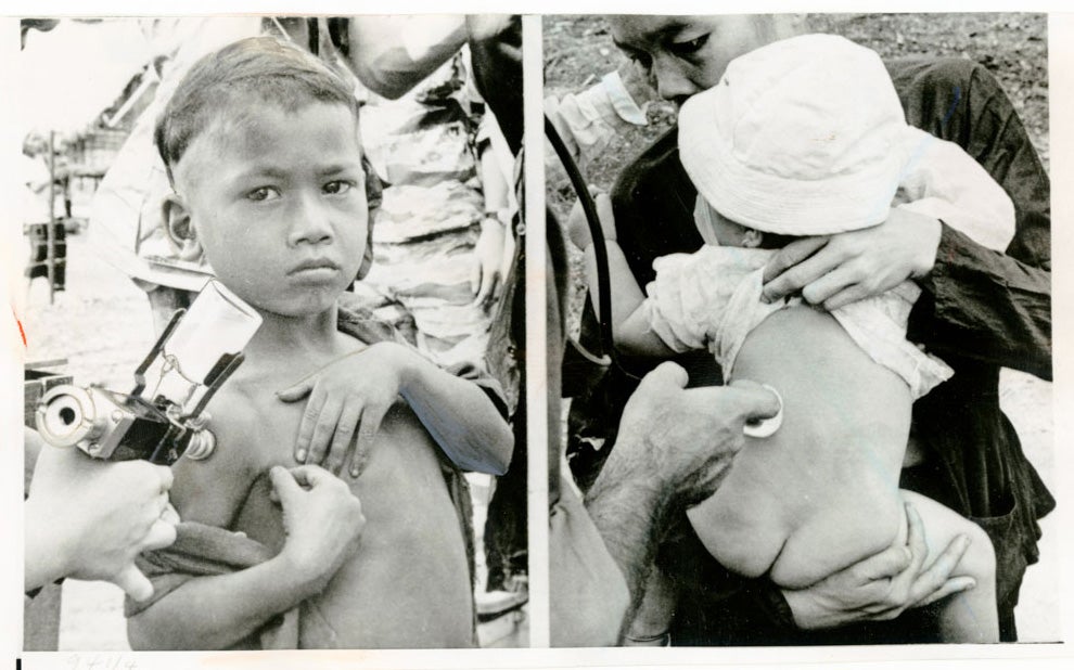 “While one Vietnamese youngster throws out his chest as he’s inoculated against cholera another child is “attacked” from the rear in “Operation MILPHAP” at An Loc in Bing Loc Province, 60 miles north of Saigon. The MILPHAP team (Military Provincial Hospital Assistance Program) provides the only medical service for the entire province. In the last two months, the team has succeeded in visiting every village and hamlet in the province not directly under Viet Cong control.”