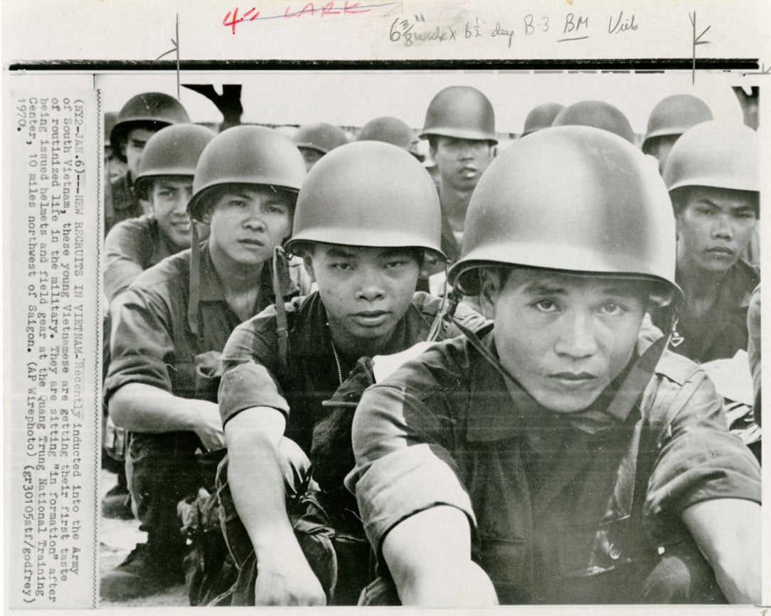 “Recently inducted into the Army of South Vietnam, these young Vietnamese are getting their first taste of routinized life in the military. They are sitting ‘in formation’ after being issued helmets and field gear at the Quang Trung National Training Center, 10 miles northwest of Saigon.”