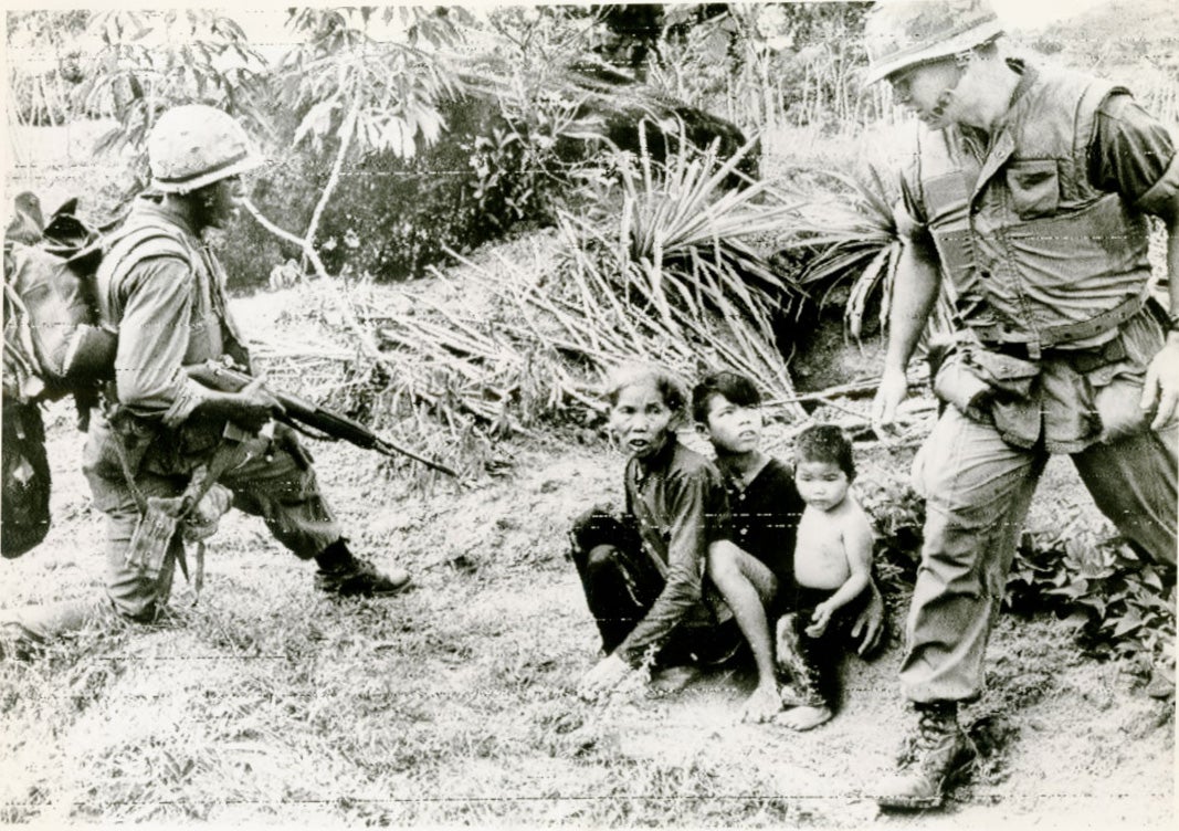 “An old Vietnamese woman and two children are temporarily kept under guard by U.S. Marines after being flushed from a brush where they were taking cover from nearby fighting south of Da Nang.”