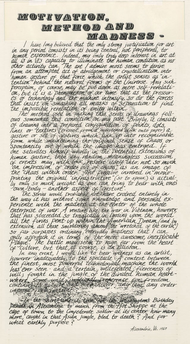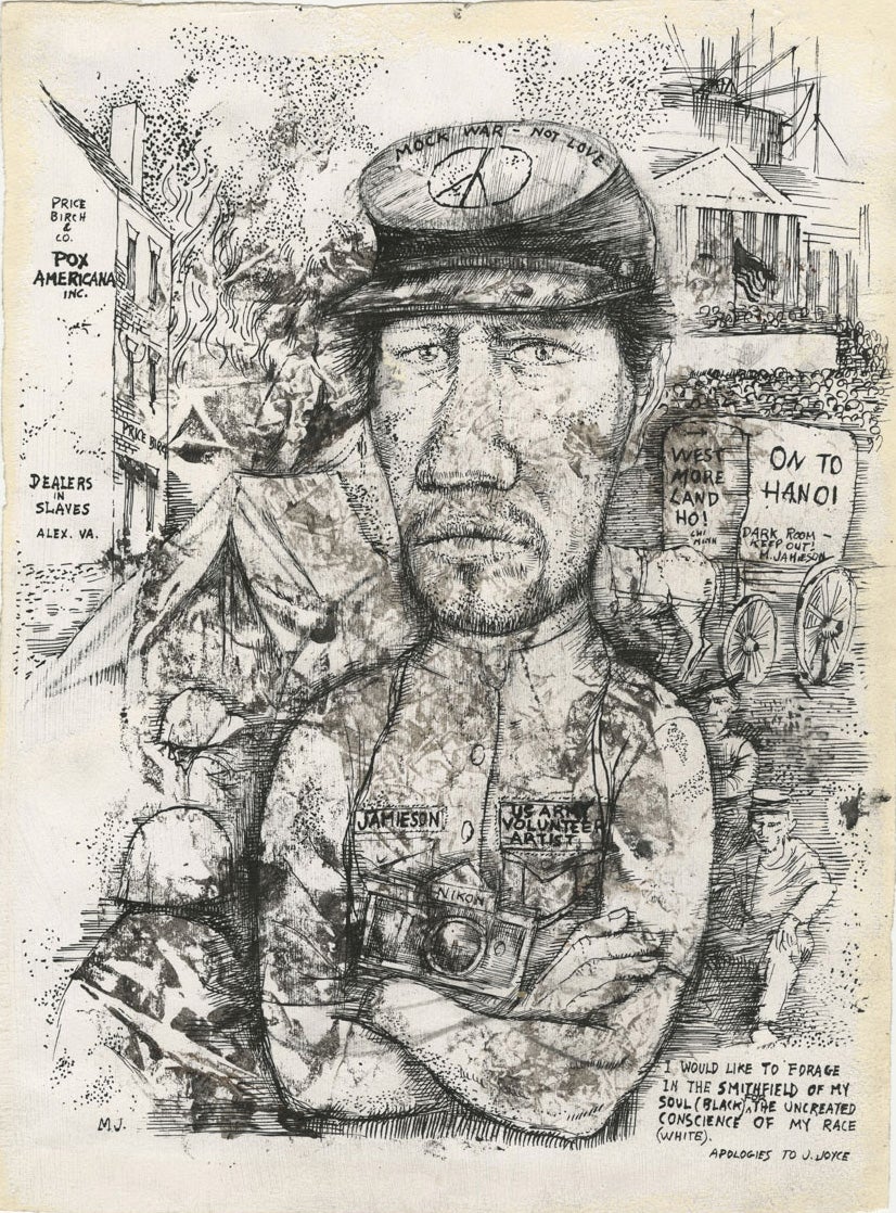 Mitchell Jamieson, an award-winning WWII artist, volunteered to document the war in Vietnam. His self-portrait is accompanied by a hand-written description of the process of art making and the evident horror he experienced on the front lines, referring to the war as a “plague.” Profoundly affected by the events he witnessed in Vietnam, Jamieson committed suicide in 1976.