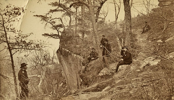 Photograph of General Ulysses S. Grant and Staff on Lookout Mountain. The photo was taken in November 1863 after the “Battle Above the Clouds.” Those depicted are General Grant, General Webster, Colonel Lago, Colonel Hillyard, and Colonel Rawley. Copyrighted by G. M. Brandt and Co. of Chattanooga, Tennessee. Photo taken by A. W. Judd, Portrait and Landscape Photographer.
