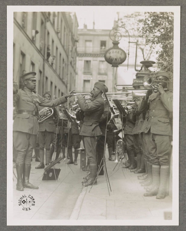 James Reese Europe and Black musicians play jazz for wounded American soldiers and the people of France outside a hospital, 1918