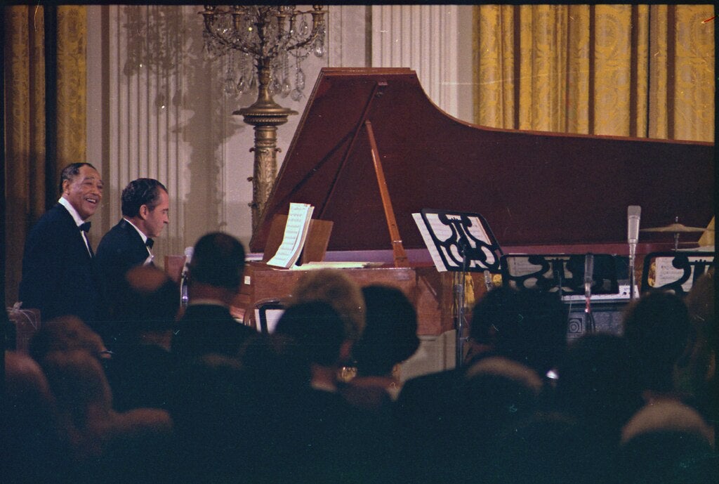 During the presidencies of Lyndon Baines Johnson and Richard M. Nixon, Duke Ellington frequently performed at the White House, located only ten blocks from his birthplace. On his 70th birthday, President Nixon recognized Ellington’s musical achievements, which included several goodwill tours under the auspices of the State Department, by awarding him the Presidential Medal of Freedom.
