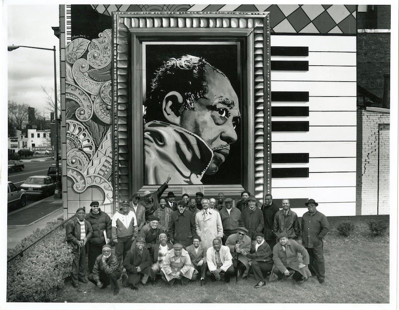 The Listening Group gathers in front of the Duke Ellington mural, c. 1992