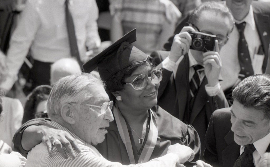 Pearl Bailey celebrates her Georgetown graduation with Philosophy professor Wilfrid Desan, May 1985