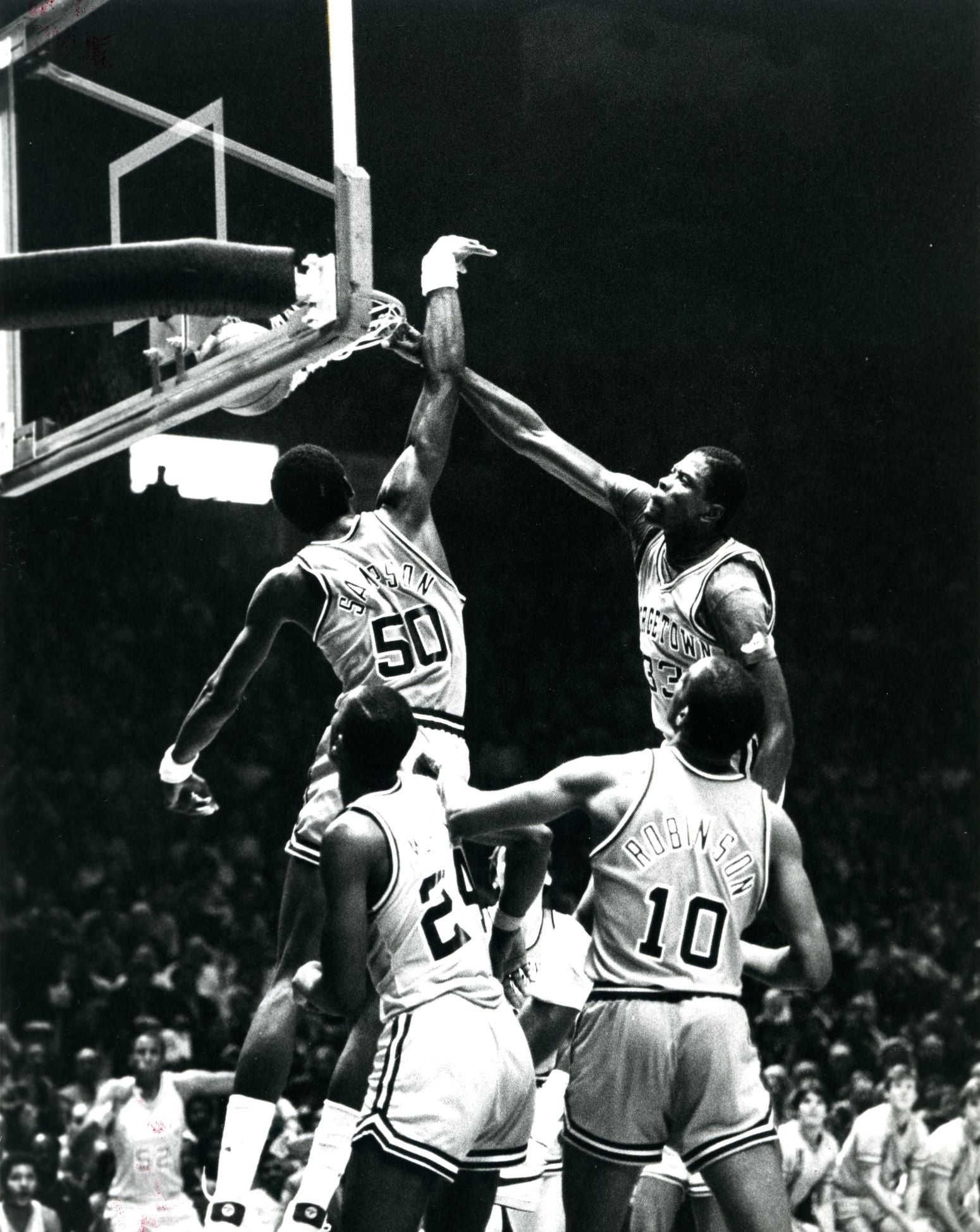 Patrick Ewing emphatically dunks over UVA center Ralph Sampson during the “Game of the Decade,” December 9, 1982