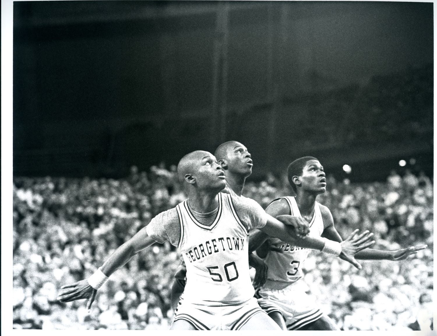 Freshman stars Michael Graham and Reggie Williams in position to grab a rebound, 1984