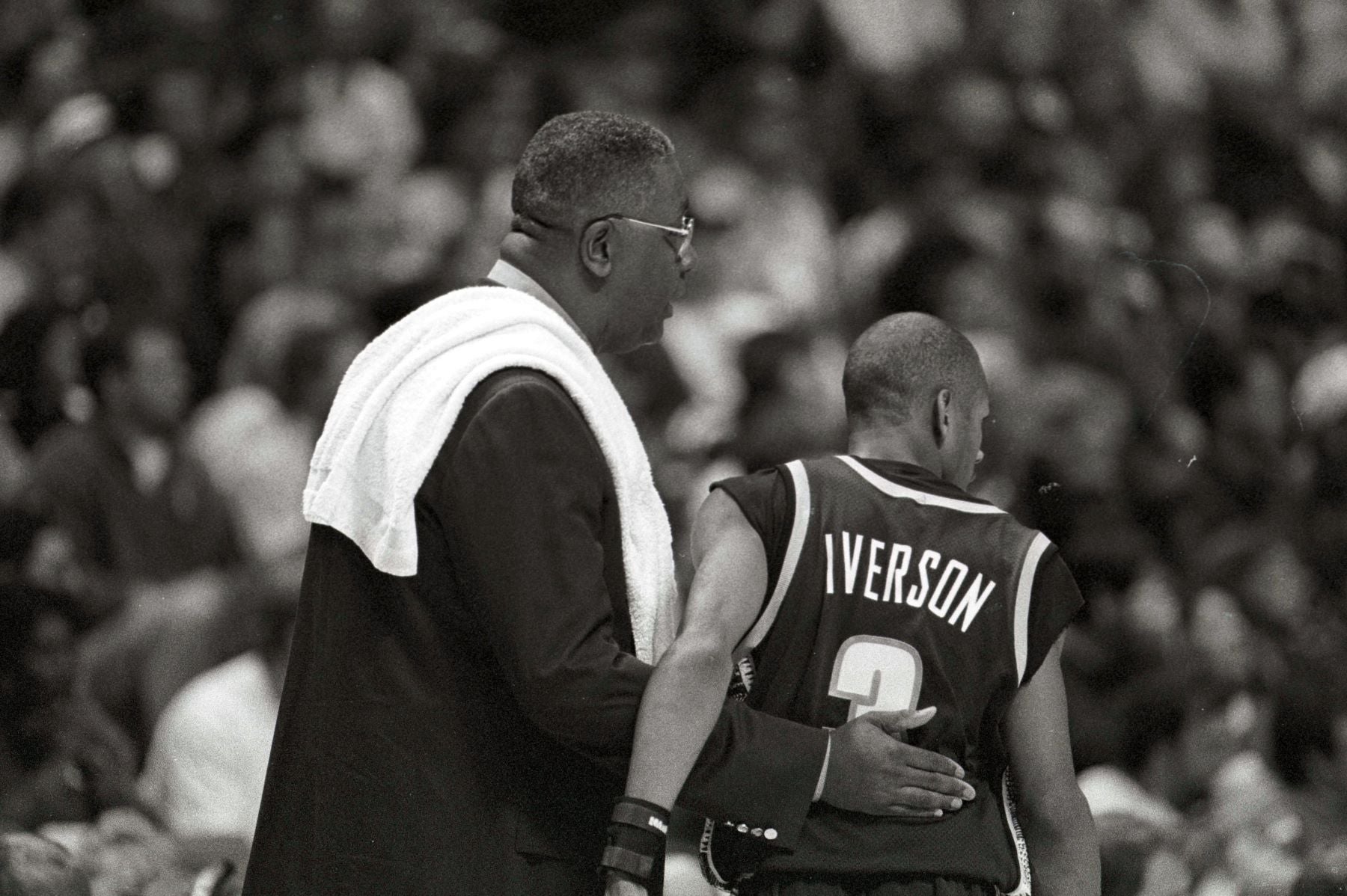 When he was still in detention, Iverson’s mother approached Thompson to ask him to help her son get to college and start a new life. The next time Iverson played competitively, he played in the 1994 Kenner League in McDonough Gym, captivating an overflow crowd. During away games, racist taunts directed at Iverson were common. At Villanova, fans wore black-and-white prison garb, with one holding a sign, “Iverson: the Next O.J.” After Coach Thompson threatened to pull his players off the court, such visible and public incidents never happened again while Iverson played in college.