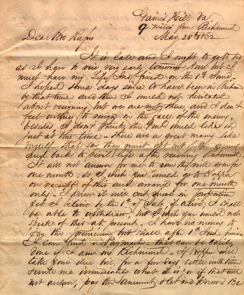 Autograph Letter Signed, Gaines' Mill, 9 miles from Richmond, Virginia
