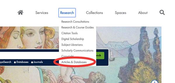 “Articles & Databases,” under the “Research” tab, links to a full, searchable list of databases the Library subscribes to.