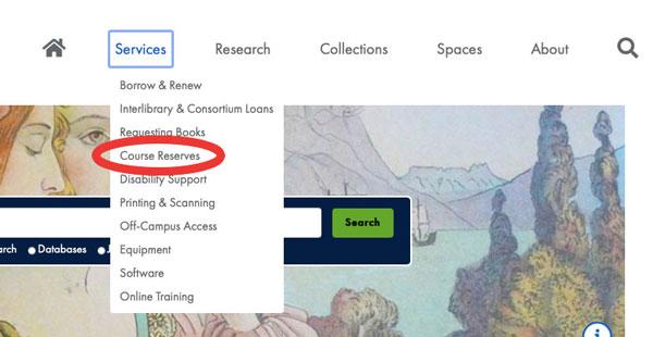 The “Course Reserves” entry under the Services tab in the main navigation allows faculty and instructors to place both physical and digital items on reserve. Students can find course materials that have been placed on reserve there as well.