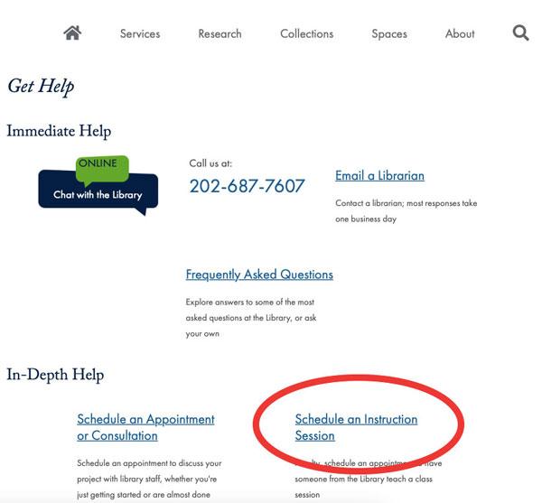 Librarians and other Library staff are available to teach a variety of classes on research skills, course-specific resources, and multimedia production. To book a session, first select “Get Help” from the quick links menu. Then, select “Schedule an Instruction Session” from the Get Help page.
