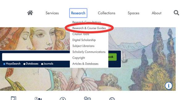 All subject and course-specific research guides are still available at guides.library.georgetown.edu. From the Library home page, find them under the “Research” tab.
