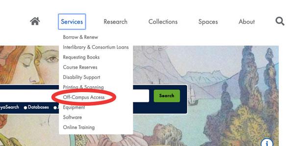The “Off-Campus Access” entry under the “Services” tab provides information about finding books, journals, and databases from off-campus. You can get these materials through the Library website, or by using Lean Library, a browser extension that will automatically connect you to resources the Library subscribes to through the Library’s proxy server, allowing you to easily log in without having to return to the Library website.