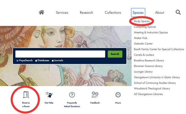 Study spaces can be reserved under the “Spaces” tab in the main navigation menu. You can also reserve a study space in the quick links menu underneath the catalog search.