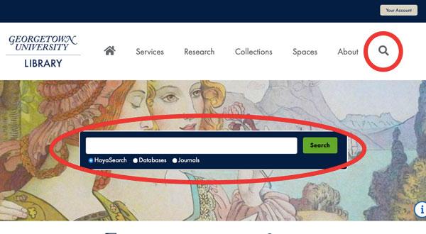 As before, our catalog search remains front and center. There you can also find databases and journals. To search the website, however, use the magnifying glass at the top right of the page.
