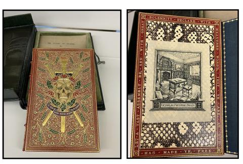 After pulling the book and opening the box I found this jaw-dropping custom binding by the English firm Sangorski & Sutcliffe. Boxes are used to protect books, especially when they might have decorative covers, but I was amazed to see such an intricately designed bookbinding. There are so many more amazing bindings, illustrations, texts, and more in the collections. I am excited to continue learning what is here and sharing some of the things I find. If you’ve been in for class, research, a tour, or simply by, I hope you had a chance to see something unique. If you haven’t been in, please make an appointment to visit, I’ll be delighted to share the collection with you!