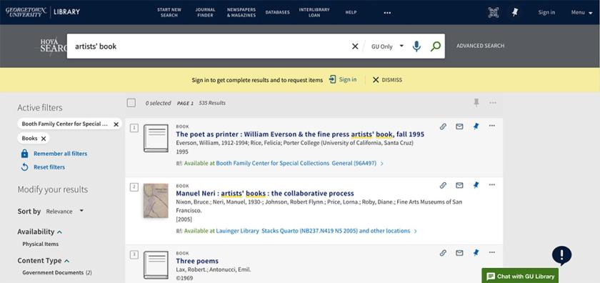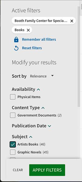 I decided to start my catalog search with the keyword “artists’ books.” As a genre, artists’ books push and often break the boundaries of what a book can, and should, look like and are often intricately crafted. They are one of my favorite genres of books in special collections. After searching and getting more than 500 results I decided to use specific subject terms from the left toolbar to narrow down my search.