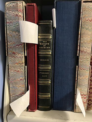 One of my favorite ways to get to know the collection is by browsing the stacks and seeing what catches my eye. You never quite know what you’ll find once you pull a book off the shelf. Sometimes the results are almost unbelievable. I was in our vault recently and spotted this box with the spine title The Masque of Anarchy. I was intrigued.
